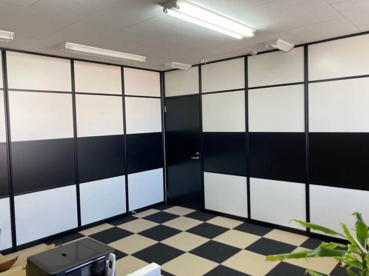 応接室をリーズナブルに作りたいなら、アルミパーテーションがおすすめです。シンプルでコストパフォーマンスの良い間仕切りで、色のバリエーションも豊富です。事例では、ブロックパネルを選び、デザイン性も高いおしゃれな応接会議室になっています。