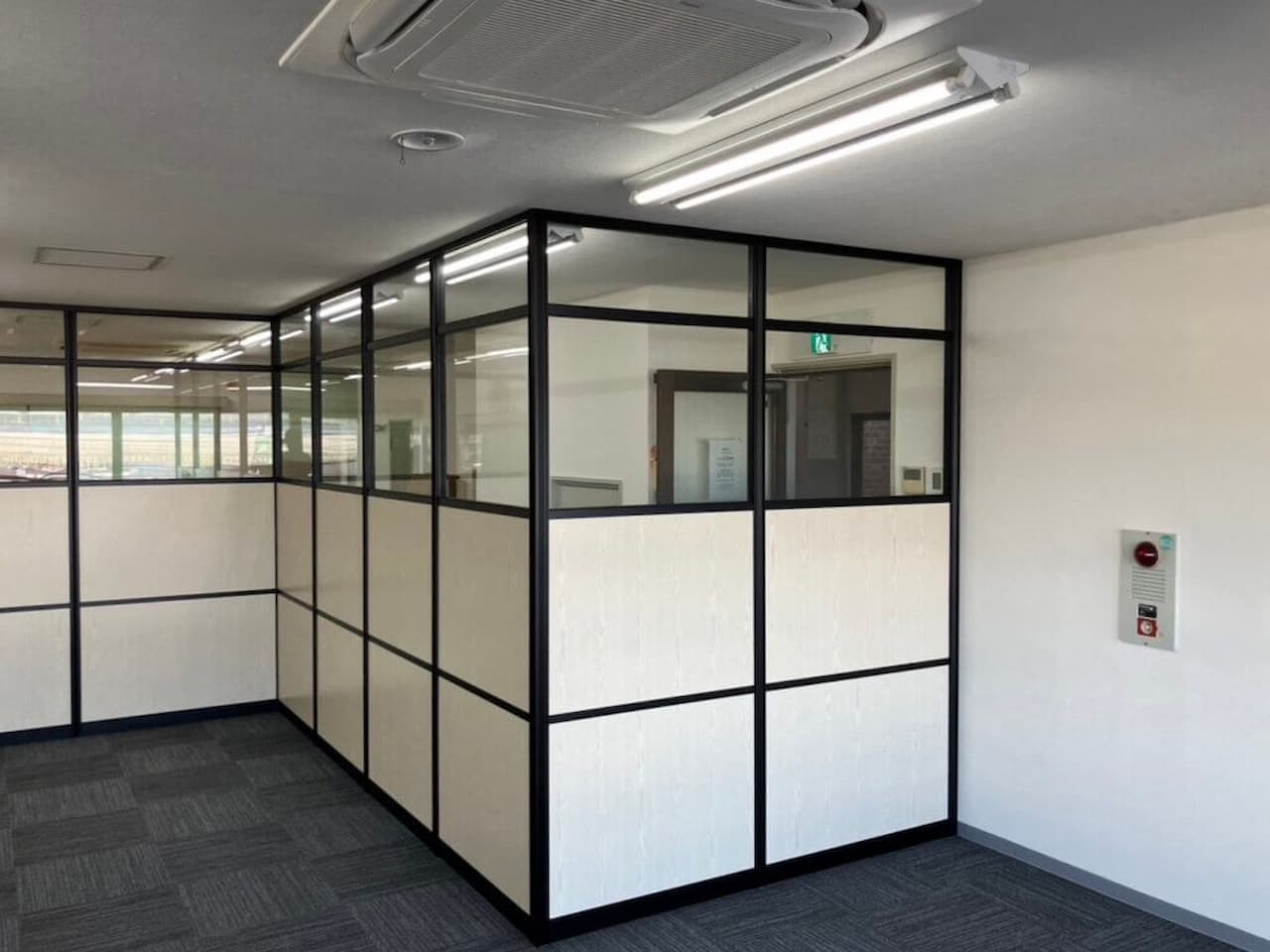 ガラスパーテーションは、アルミまたはスチール製のフレームにガラスを挟み込んだタイプと、ガラス同士が連なった連装ガラスタイプがあります。もっとも安価なのはアルミタイプです。ブラックフレームとガラスを組み合わせると、クールでおしゃれな雰囲気になります。ホワイトフレームとの組み合わせでは、さわやかで明るい空間がつくれます。
